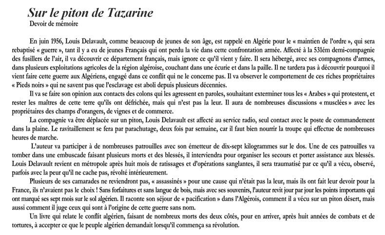 En juin 1956, Louis Delavault sera rappelé dans les fusiliers de l’air de la 531e demi-brigade pour « pacifier » le département français qu’est l’Algérie. L’auteur reviendra, comme beaucoup de ces