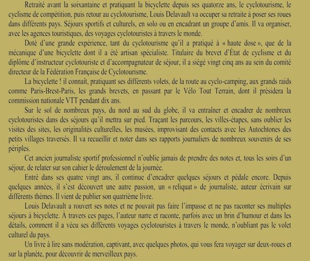 Louis Delavault est un autodidacte, journaliste sportif, retraité après un emploi de monteur en optique, sa passion, c’est l’écriture et la pratique de la bicyclette sur route ou en VTT dont il sera président de la commission nationale au sein de la Fédération Française de Cyclotourisme où il siégera 25 ans au Comité directeur fédéral. À la demande des Éditions Hachette, il sera l’auteur en 1997 d’un livre dans la série sports VTT, édité par EPA Éditions. Il sera lauréat en 2000 du prix littéraire-photos « Charles Antonin ». De retour en France, après 12 années aux États-Unis dans l’État de Virginie encadre des séjours cyclotouristes à travers le monde, rédigeant des rapports pour des agences touristiques qui apprécient ses descriptions.