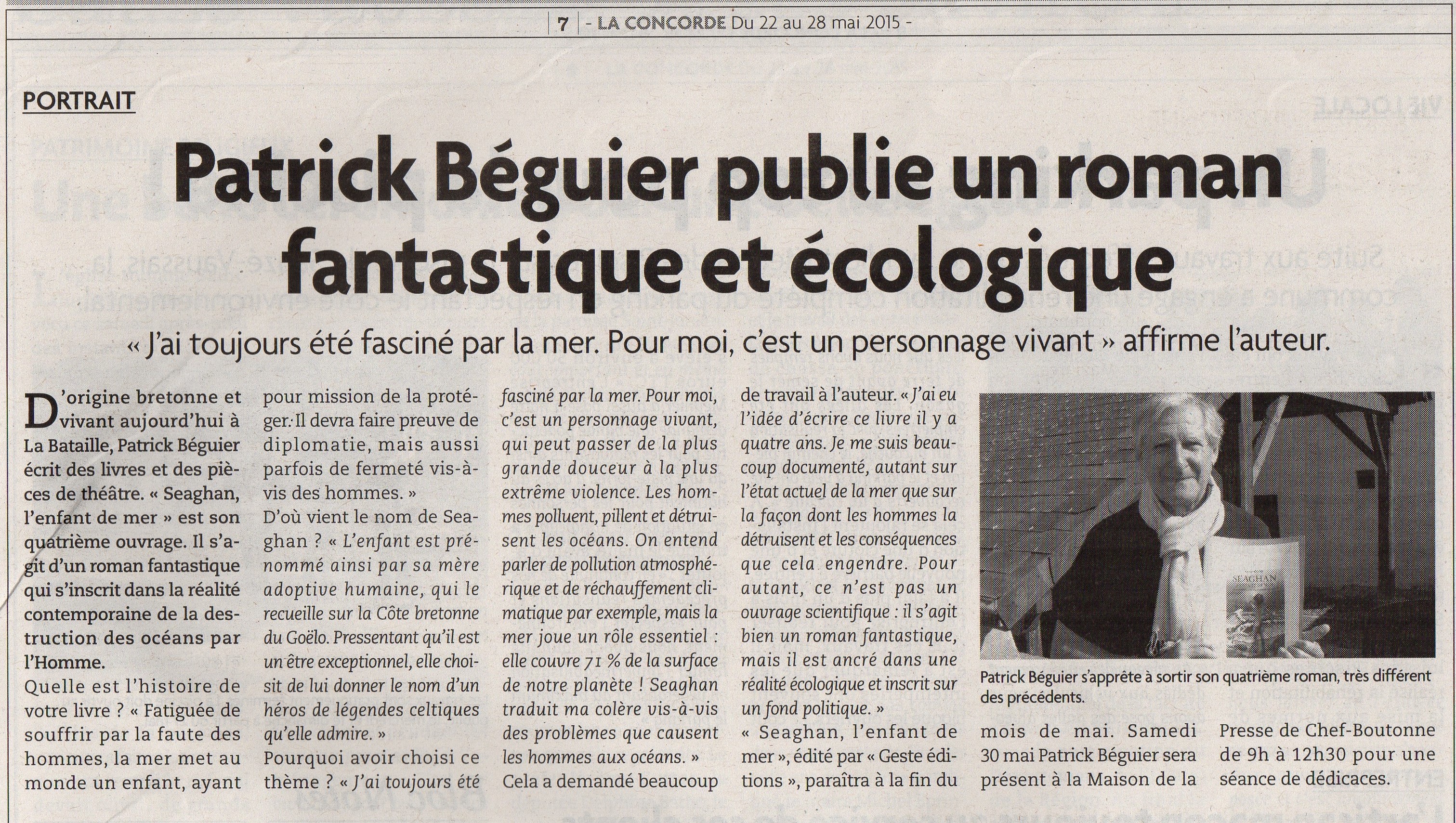 Patrick Béguier est Breton d'origine. Il a été directeur du Centre de perfectionnement des journalistes à Paris avant d'être rédacteur en chef et éditorialiste du quotidien L'Écho républicain. Devenu journaliste indépendant, il vit aujourd'hui à La Bataille, en Deux-Sèvres, où il écrit ses livres et pièces de théâtre. Seaghan, l'enfant de mer est son quatrième roman.